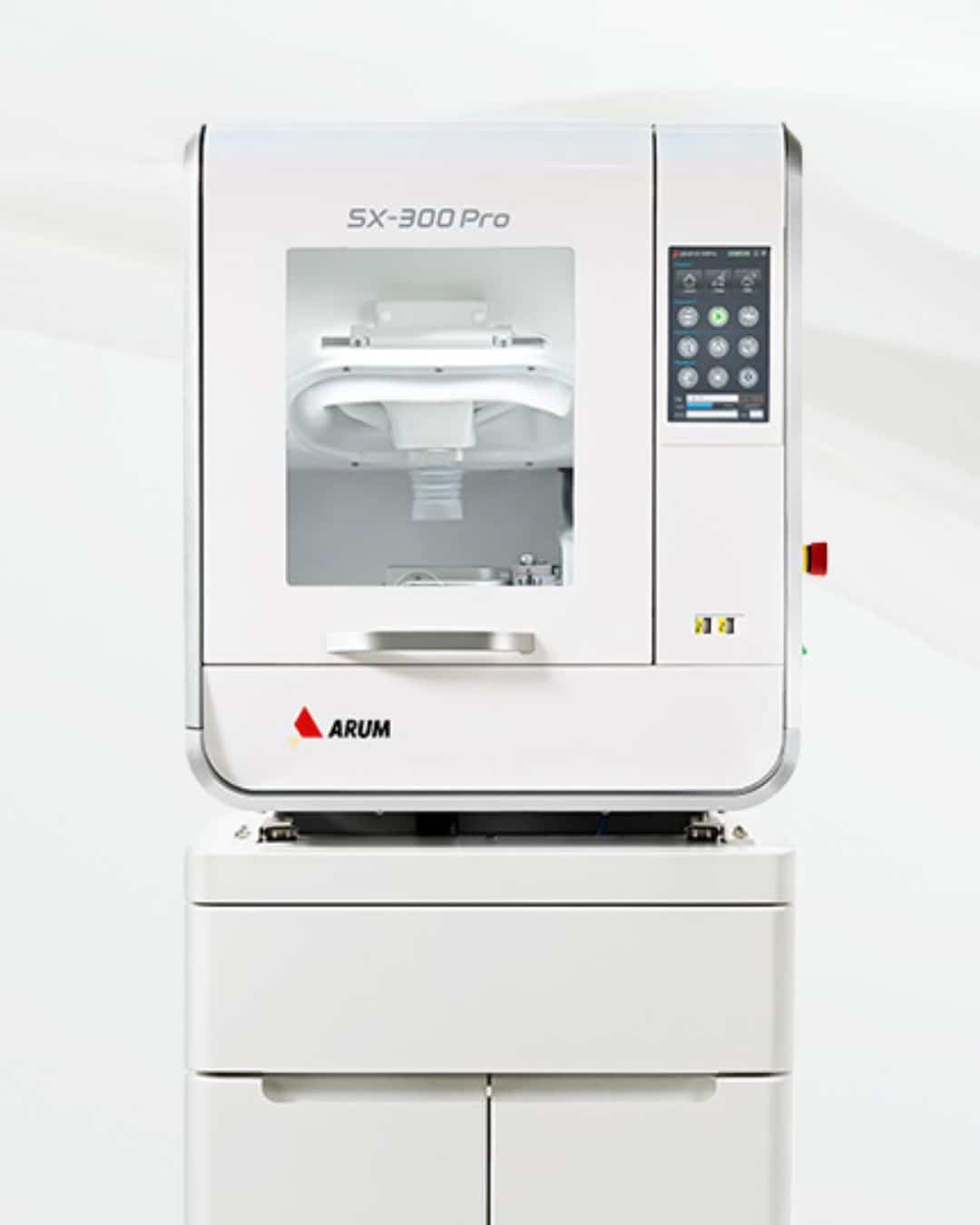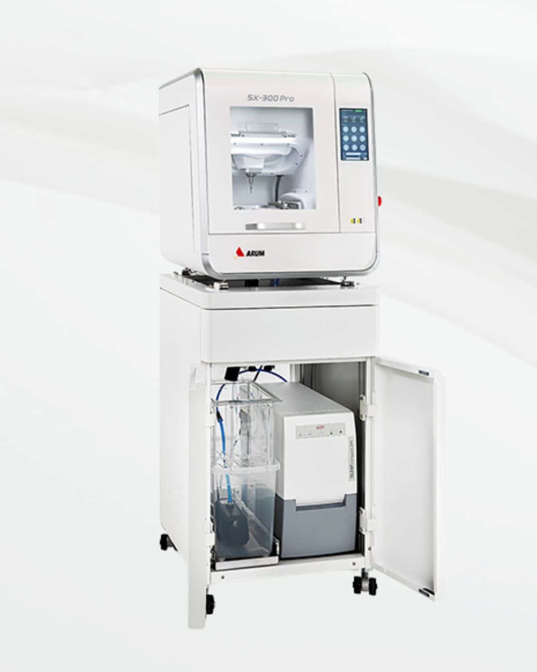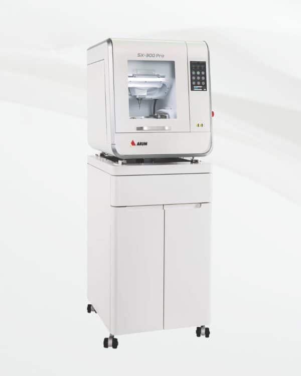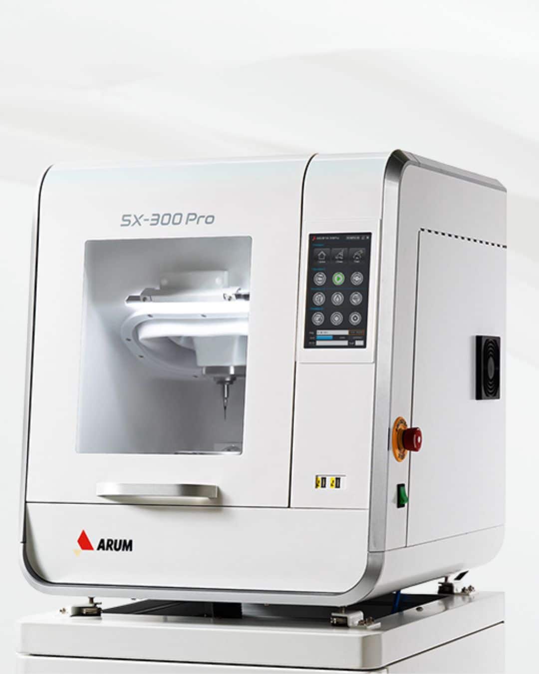 La ARUM 5X-300 Pro es una fresadora de 5 ejes simultáneos diseñada específicamente para ofrecer una calidad excelente en el mecanizado de materiales blandos, optimizando el espacio en laboratorios y clínicas dentales. Su ingeniería avanzada le permite alternar con total facilidad entre procesos de fresado en húmedo y en seco, garantizando resultados excepcionales en una amplia gama de prótesis.